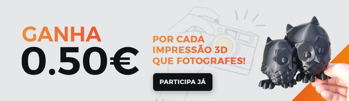 - Recebes 0,50€ ( em crédito acumulável em loja online) por cada impressão 3D singular que fotografes, caso as fotos sejam selecionadas para serem usadas nas nossas plataformas e publicações.