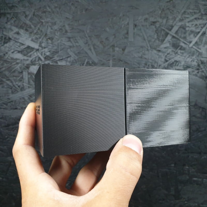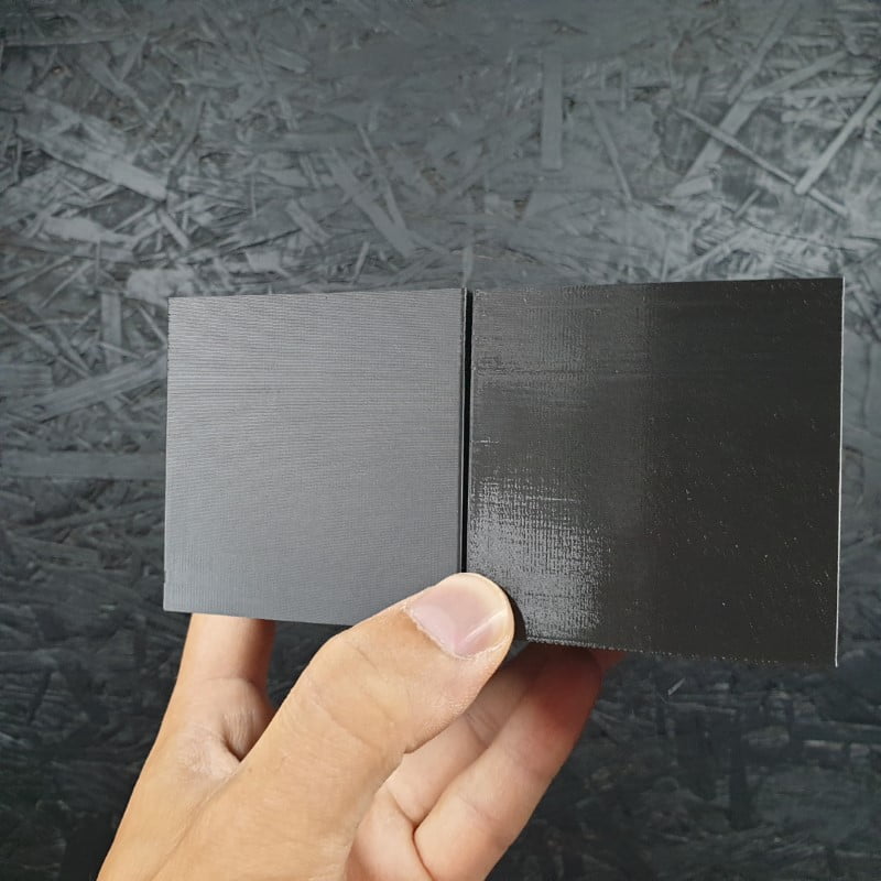 Deixamos aqui exemplos de uma comparação entre o PLA+ Preto Pastel (à esquerda, apresentando uma cor preta mais mate) e o PLA+ Preto normal (à direita, apresentando uma cor preta mais brilhante e reflectiva)