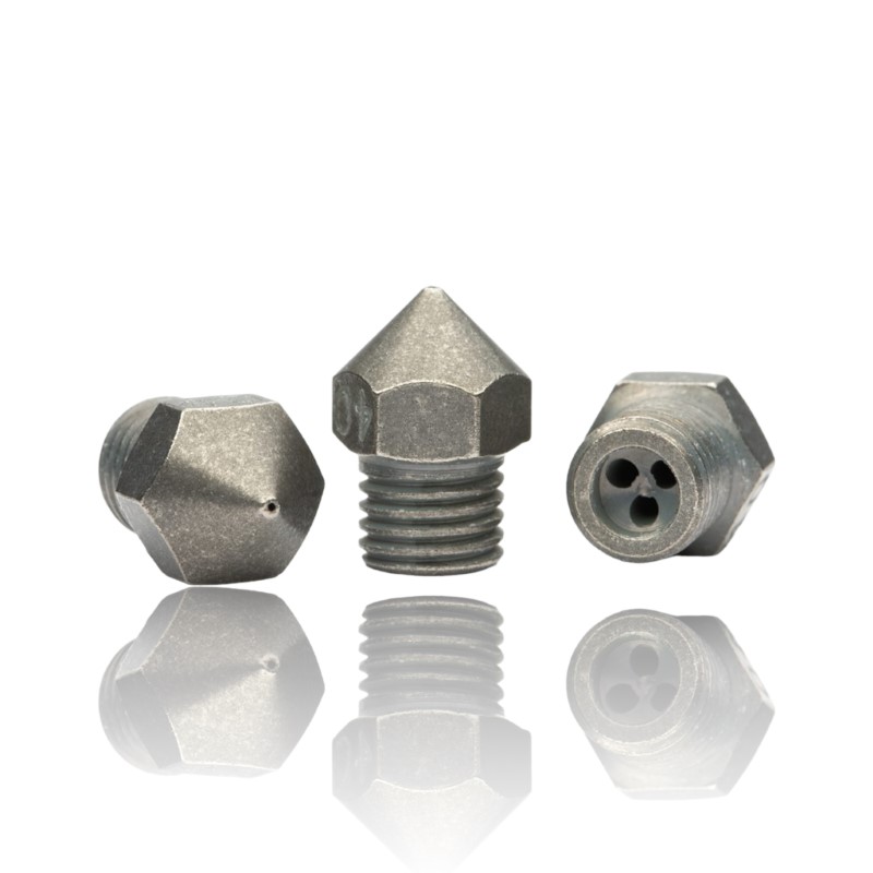 Nozzles para impressoras 3D feitas de metal com pelo menos um ou vários orifícios para aumentar a área de superfície das paredes de aquecimento.