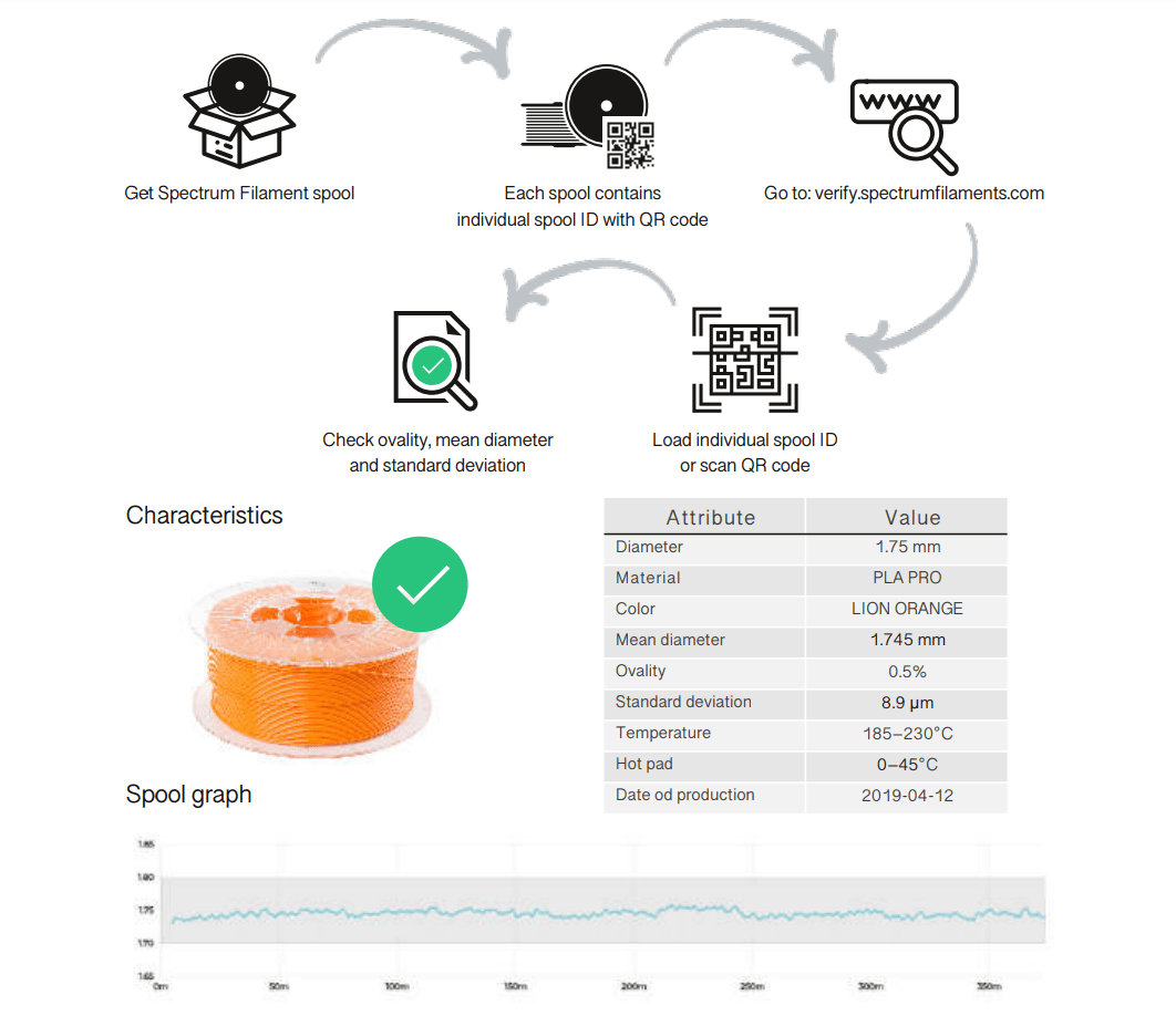 Durante a produção, cada 1mm de Spectrum Filament está a ser medido continuamente em 2 eixos com ±0,8µm de precisão, o que permite obter um produto final de alta qualidade. Para provar isto, a Spectrum Filaments, como um dos poucos fabricantes no mundo, introduziu a possibilidade de apresentação online, individualmente para cada bobina fabricada: