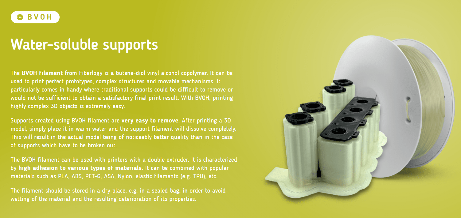 O filamento BVOH pode ser utilizado com impressoras com um extrusor duplo. Caracteriza-se por uma elevada adesão a vários tipos de materiais.