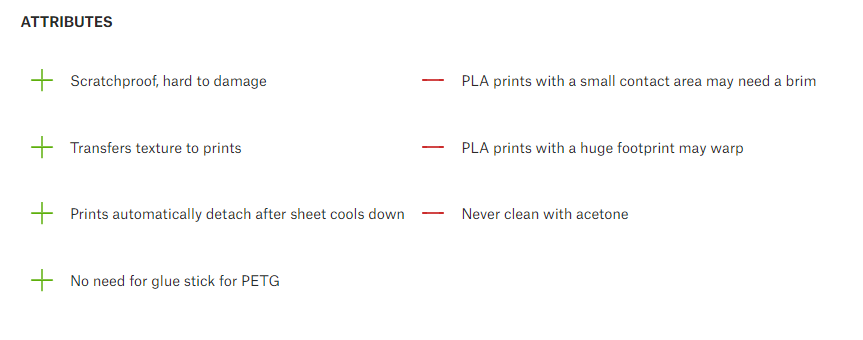 O revestimento em pó directamente sobre o metal torna muito difícil danificar esta placa de construção. Se um bocal aquecido colidir com ela, o metal pode dissipar o calor. O revestimento em pó também confere à superfície um aspecto texturado distinto que será visível nas suas impressões. A superfície texturada esconde a maior parte dos danos mecânicos causados por ferramentas. Apenas a parte de cima das pequenas saliências pode ser riscada, o que não deixa marcas na parte de baixo do modelo. Esta superfície é utilizada na nossa unidade de impressão. Veja as peças impressas que tem na sua impressora para referência.