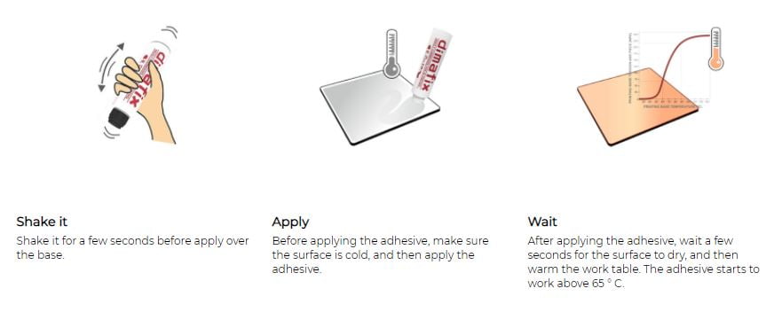 À medida que a temperatura da base de impressão aumenta, a aderência de Dimafix® aumenta.