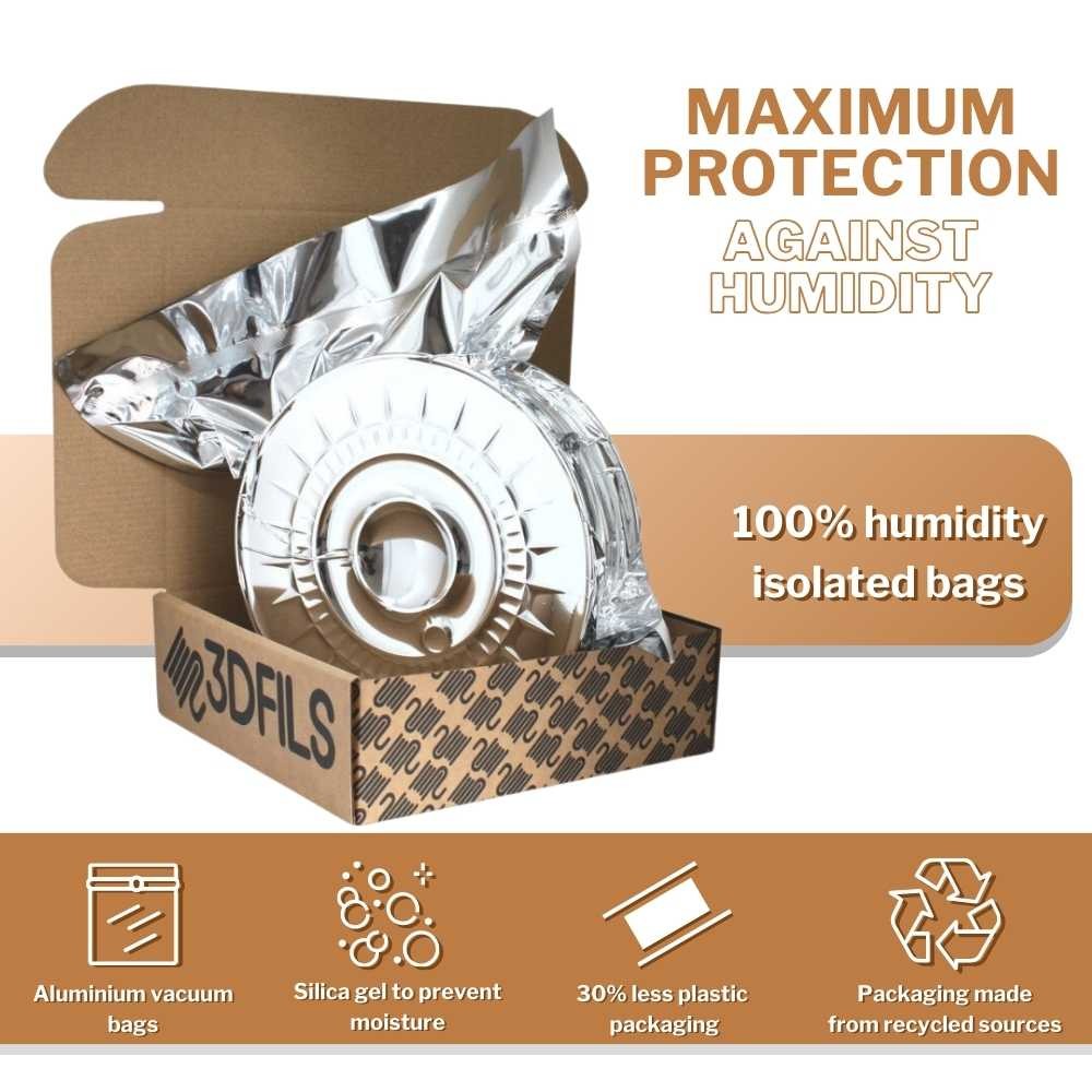 Embalado a vácuo em sacos de 90 mícrons com um saco de sílica gel no interior para garantir a sua conservação e a ausência de humidade. Disponível em bobinas de filamento de 750g e 1Kg. Filamento disponível em 1,75mm de diâmetro.