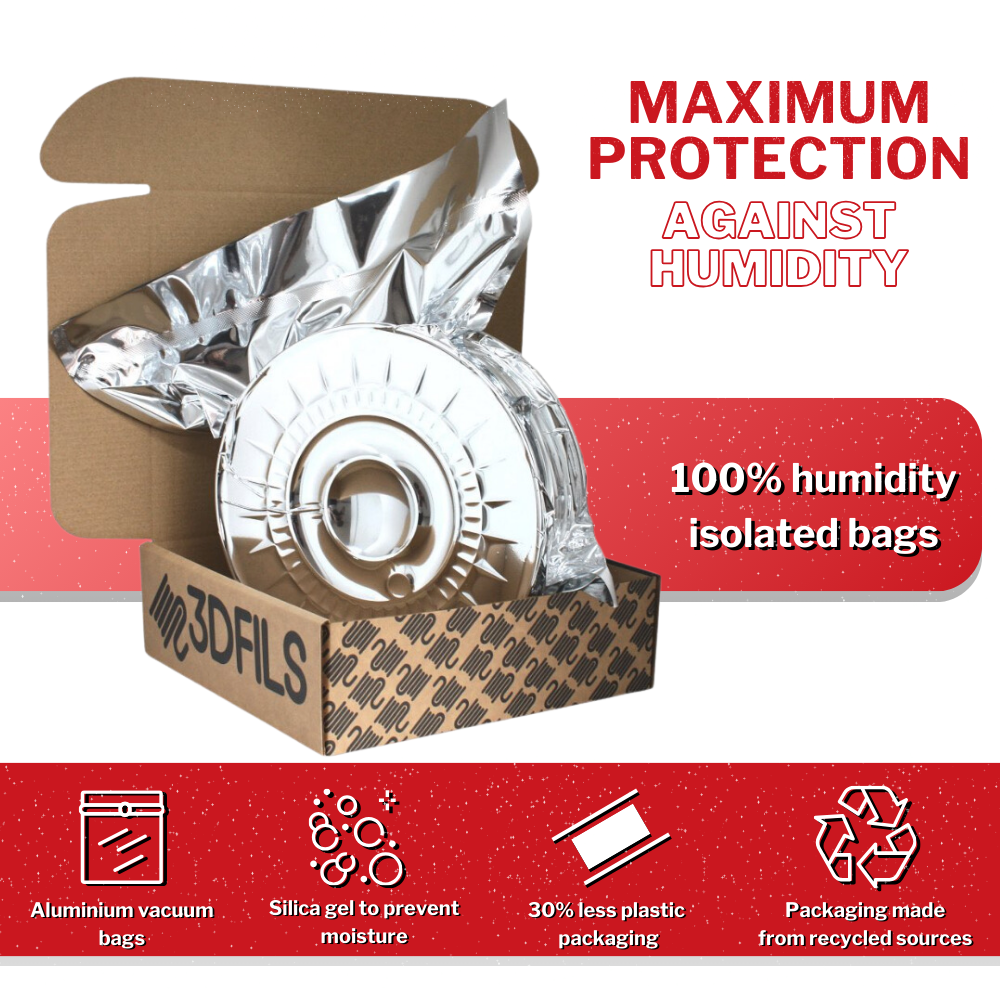 Embalado a vácuo em sacos de 90 mícrons com um saco de sílica gel no interior para garantir a sua conservação e a ausência de humidade. Disponível em bobinas de filamento de 750g e 1Kg. Filamento disponível em 1,75mm de diâmetro.