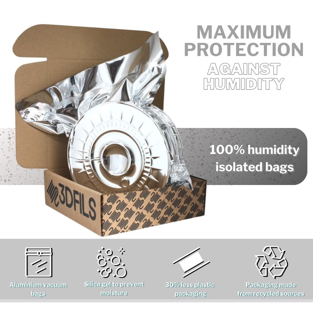 Embalado a vácuo em sacos de 90 mícrons com um saco de sílica gel no interior para garantir a sua conservação e a ausência de humidade. Disponível em bobinas de filamento de 750g e 1Kg. Filamento disponível em 1,75mm de diâmetro.