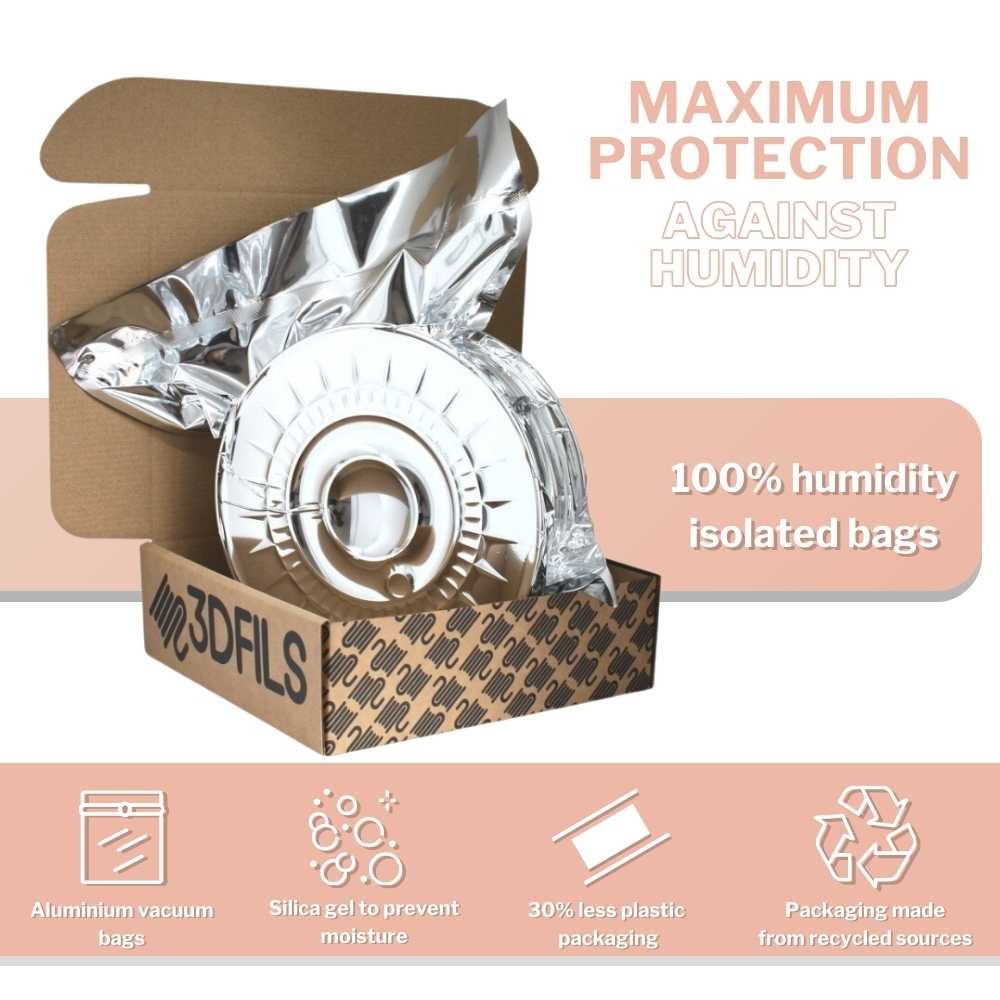 Embalado a vácuo em sacos de 90 mícrons com um saco de sílica gel no interior para garantir a sua conservação e a ausência de humidade. Disponível em bobinas de filamento de 750g e 1Kg. Filamento disponível em 1,75mm de diâmetro.