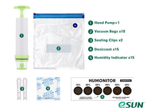 1. Coloque os filamentos 3D, o cartão indicador de humidade e o dessecante no saco de vácuo