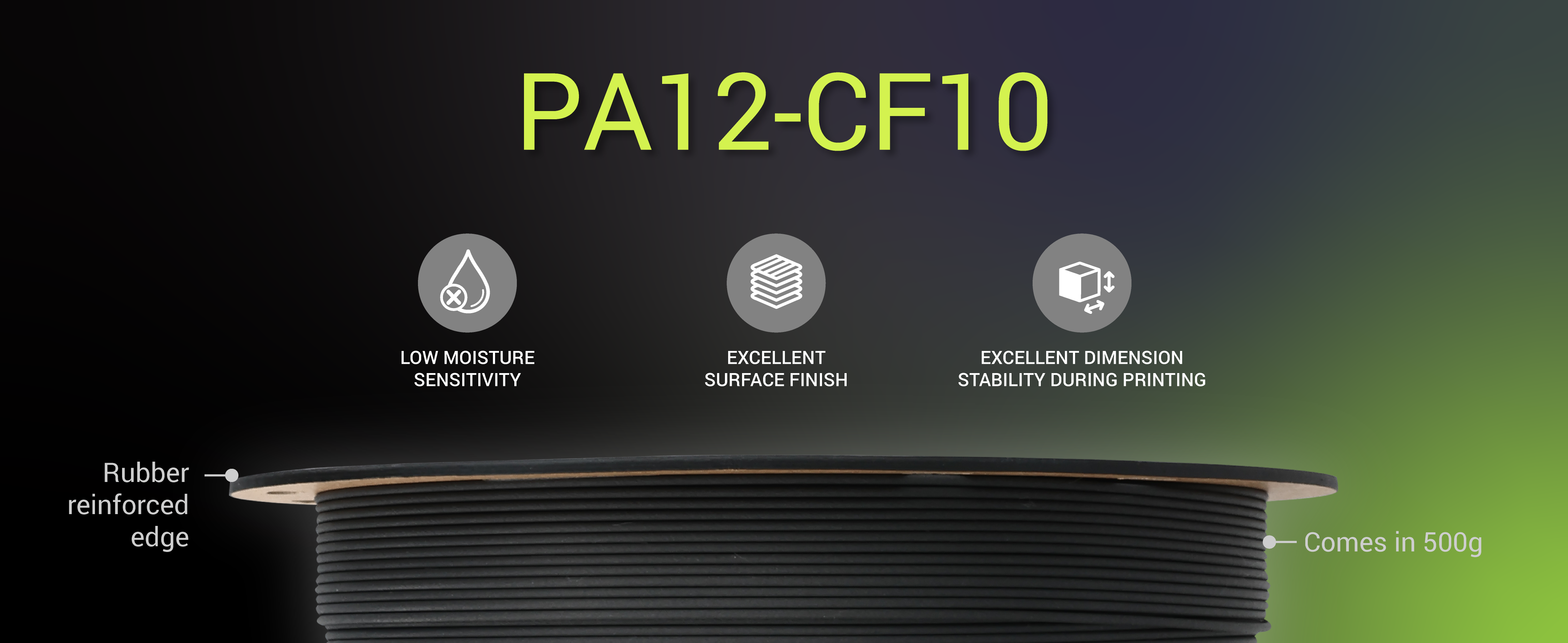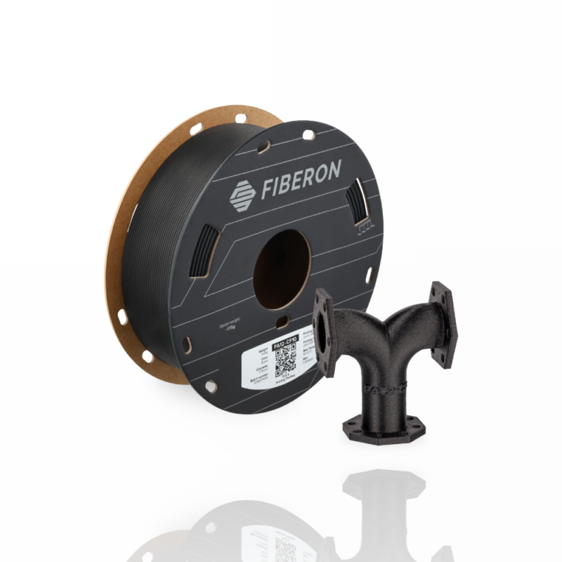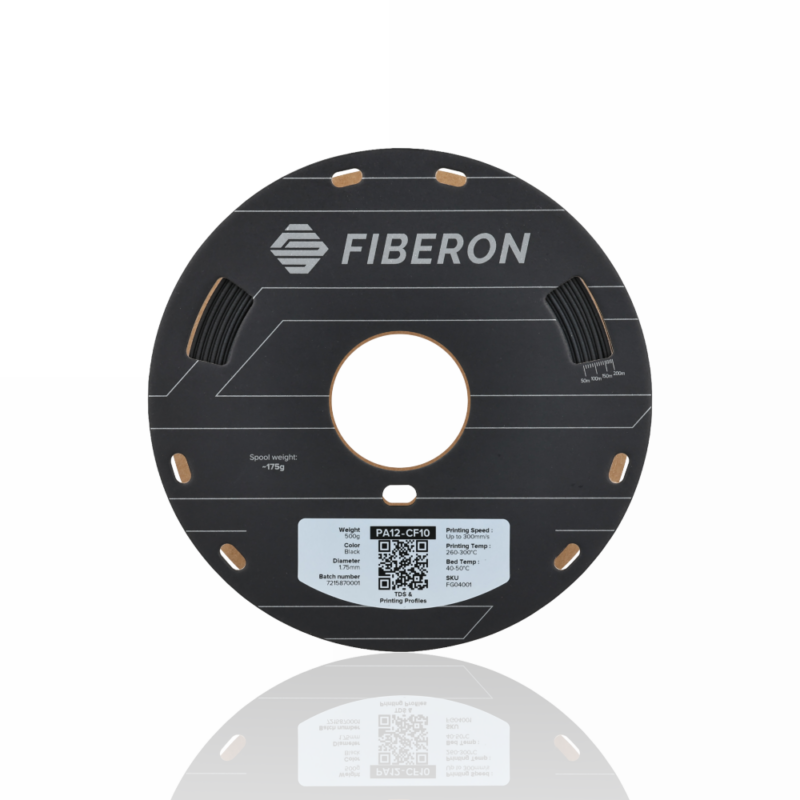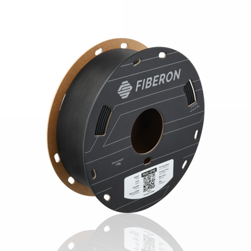 Fiberon™ PA12-CF10 é um filamento de copoliamida de cadeia longa reforçado com fibra de carbono. Graças à sua estrutura química, este produto possui uma sensibilidade reduzida à humidade comparativamente aos materiais baseados em PA6/66 e PA6, bem como melhores propriedades mecânicas em relação aos materiais à base de PA12 convencionais. Além disso, o reforço com fibra de carbono e a tecnologia Warp-free™ aumentam significativamente a estabilidade dimensional das peças impressas com este material.