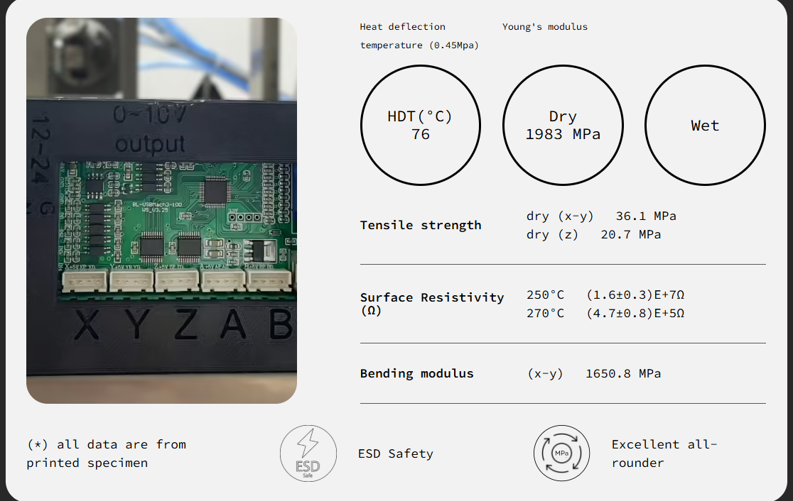 O PETG-ESD combina as propriedades do PETG com a capacidade de controlar descargas eletrostáticas (ESD), tornando-se um material ideal para aplicações que exigem proteção contra ESD. É amplamente utilizado em embalagens de componentes eletrónicos, fixações, gabaritos e ferramentas de montagem em ambientes sensíveis a descargas eletrostáticas.