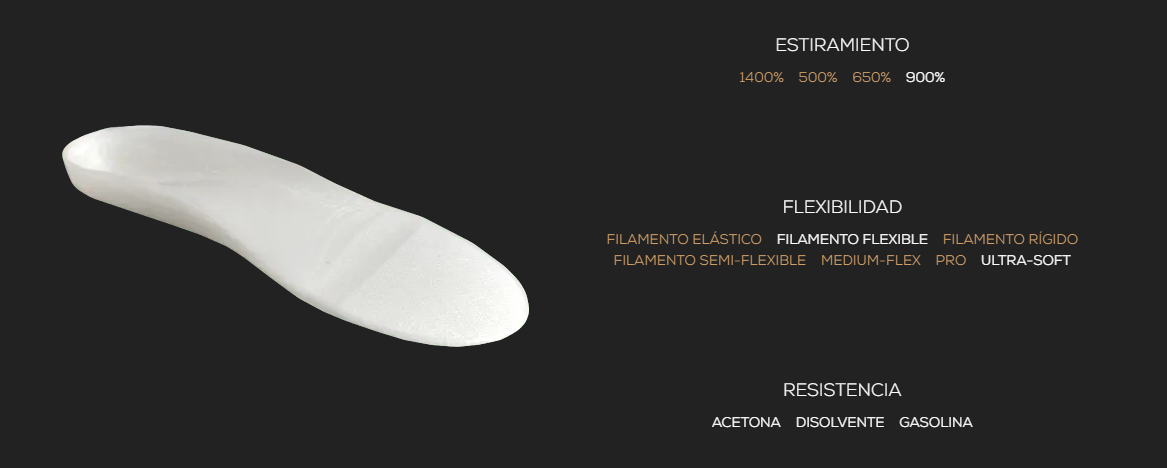 Filaflex 70A, ‘Ultra-Soft’, é um filamento elástico TPE (elastómero termoplástico) à base de poliuretano, cujas propriedades o tornam comparável ao silicone.