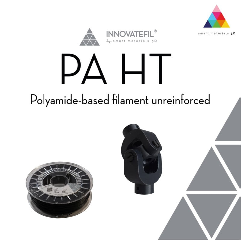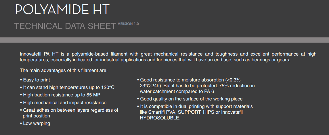 Innovatefil PA HT é um filamento à base de poliamida com elevada resistência mecânica e tenacidade e excelente desempenho a altas temperaturas especialmente adequado para aplicações industriais e para peças que vão ter uma utilização final, tais como rolamentos ou engrenagens.
