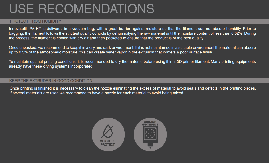 Normalmente os filamentos Nylon são altamente higroscópicos, absorvendo rapidamente a humidade do ar passados poucos minutos após abertos, impossibilitando desta forma a correcta impressão 3D do mesmos. O resultado das impressões 3D de materiais com humidade tendem a ser frágeis e de acabamento irregular ou em certos casos, torna-se simplesmente impossíveis de imprimir.