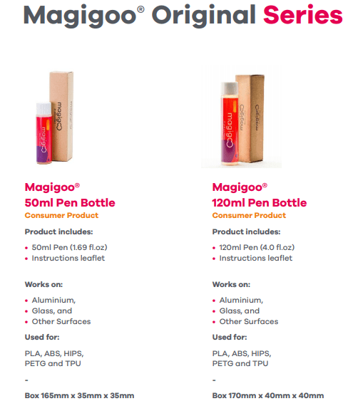 Magigoo é a nova geração de componentes de aderência à base de impressão 3D. Os produtos de geração anterior eram em formato de spray,que precisam de ser pulverizados com a base fora da impressora 3D para evitar a deterioração dos componentes da impressora 3D, contaminam o ambiente e são irritantes se utilizados em locais fechados.