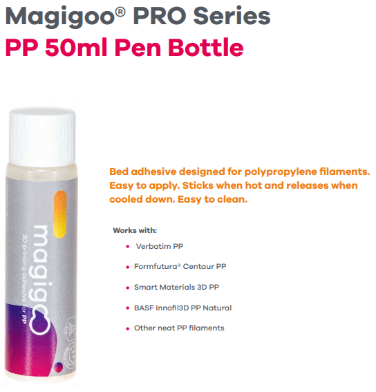 O Magigoo Pro PP foi projetado para funcionar exclusivamente com filamentos do tipo polipropileno.