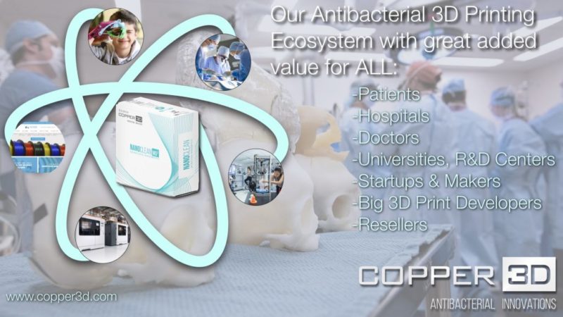 Copper3D é um fabricante de filamentos antibacterianos. O seu trabalho centra-se o desenvolver e fabricar materiais válidos para qualquer impressora 3D FDM do mercado e assim poder fabricar peças livres de bactérias. Graças à liga dos seus filamentos com nanopartículas de cobre, estes apresentam a propriedade de eliminar fungos, bactérias e vírus em poucas horas.