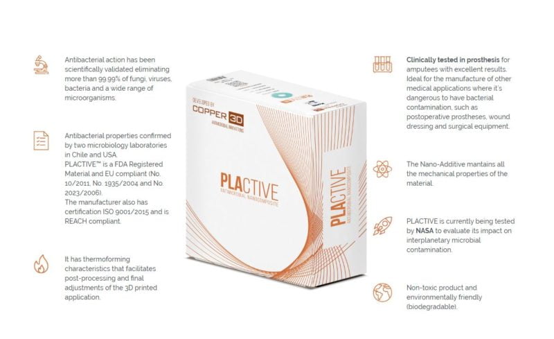 Copper3D é uma empresa chilena nascida da união de engenheiros, fisioterapeutas e médicos com o objetivo de solucionar os problemas dérmicos que sofrem pacientes que utilizam próteses. Mais de 40% dos amputados e também muitos outros pacientes que utilizam próteses, sofrem algum transtorno dérmico devido à alta carga bacteriana que apresentam estes produtos médicos em contacto com o pé. Para cobrir esta cadencia, Copper3D desenvolveu uns novos polímeros para impressão 3D com um aditivo que contém nanopartículas de cobre, altamente efetivas para eliminar fungos, vírus e bactérias, mas seguro para os humanos nas concentrações corretas.