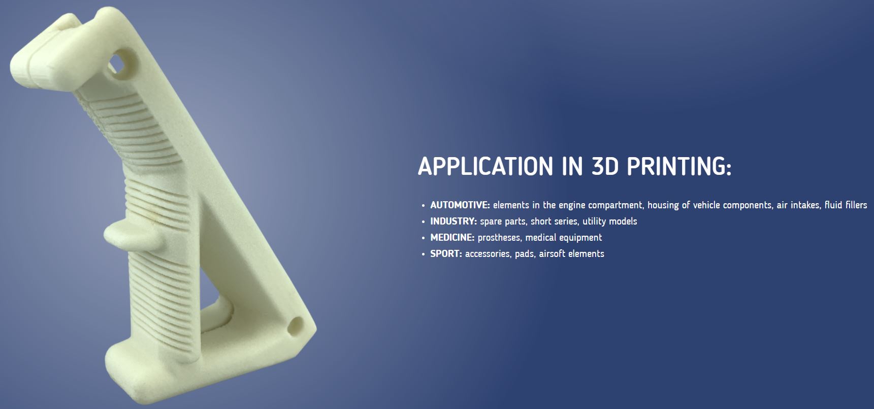 - maior resistência térmica em comparação com PA12 não modificado (resiste sem deformar até 160°C)