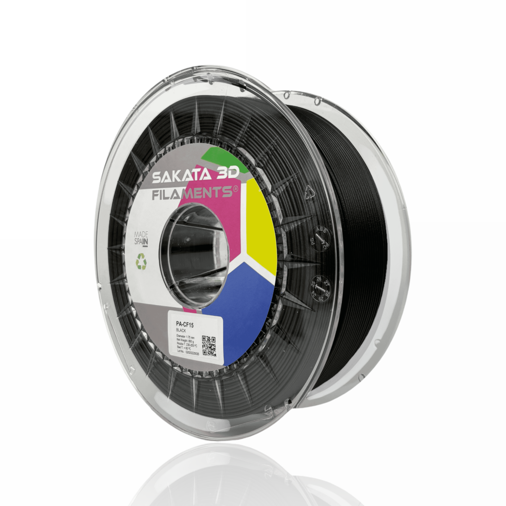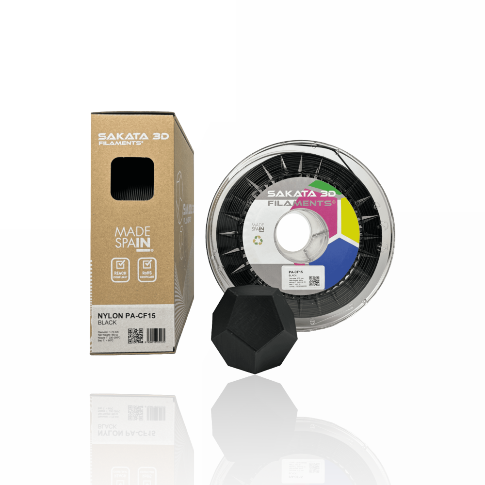 O filamento SAKATA 3D PA-CF15 Nylon é um copoliamida reforçado com 15% de fibras de carbono especiais (CF) e estabilizado termicamente, especialmente formulado para aplicações de impressão 3D. As suas principais características são a rigidez melhorada, excelentes propriedades mecânicas e resistência à abrasão, mantendo as propriedades químicas elevadas da poliamida. Apresenta também uma boa adesão entre camadas e baixa retração durante a impressão. Ideal para aplicações de engenharia e industriais que exijam leveza e elevada rigidez.