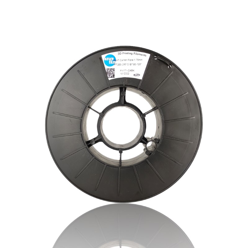 AzureFilm PAHT CF é a fórmula à base de poliamida (PA6) mais fácil de imprimir, contendo fibras de carbono que poderá encontrar no mercado, com capacidade para ser imprimível em máquinas de câmara não aquecidas. O material é resistente, tem excelente resistência à abrasão, resistência à fadiga, boa resistência química, alta resistência e rigidez. Além de ter excelente resistência à tracção e ao impacto, o material composto permite uma utilização contínua curta até 160°C (Tempo de vida útil máximo 200h). O material é totalmente compatível com suportes solúveis tais como PVA, BVOH, PVOH e totalmente compatível com suportes separadores tais como HIPS. A sua absorção de água demora cerca de 4 vezes mais tempo a atingir o ponto de saturação em comparação com PA6 não modificado e tem um ponto de saturação 5 vezes mais baixo do que os materiais PA6 convencionais. A espessura das fibras no seu interior varia entre 0,4mm-0,6mm, razão pela qual o diâmetro do bico tem de ser > 0,6mm.