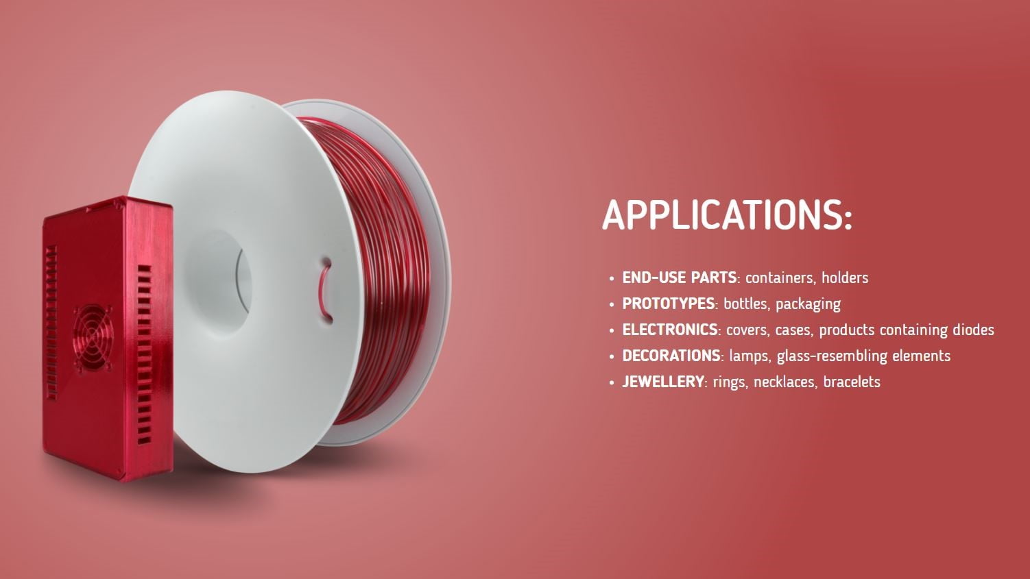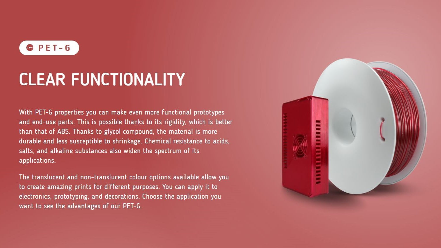 As suas propriedades permitem a impressão de elementos precisos e de formas complexas, sendo que o PETG pode ser utilizado para criar protótipos funcionais, gadgets, brinquedos e objectos decorativos.