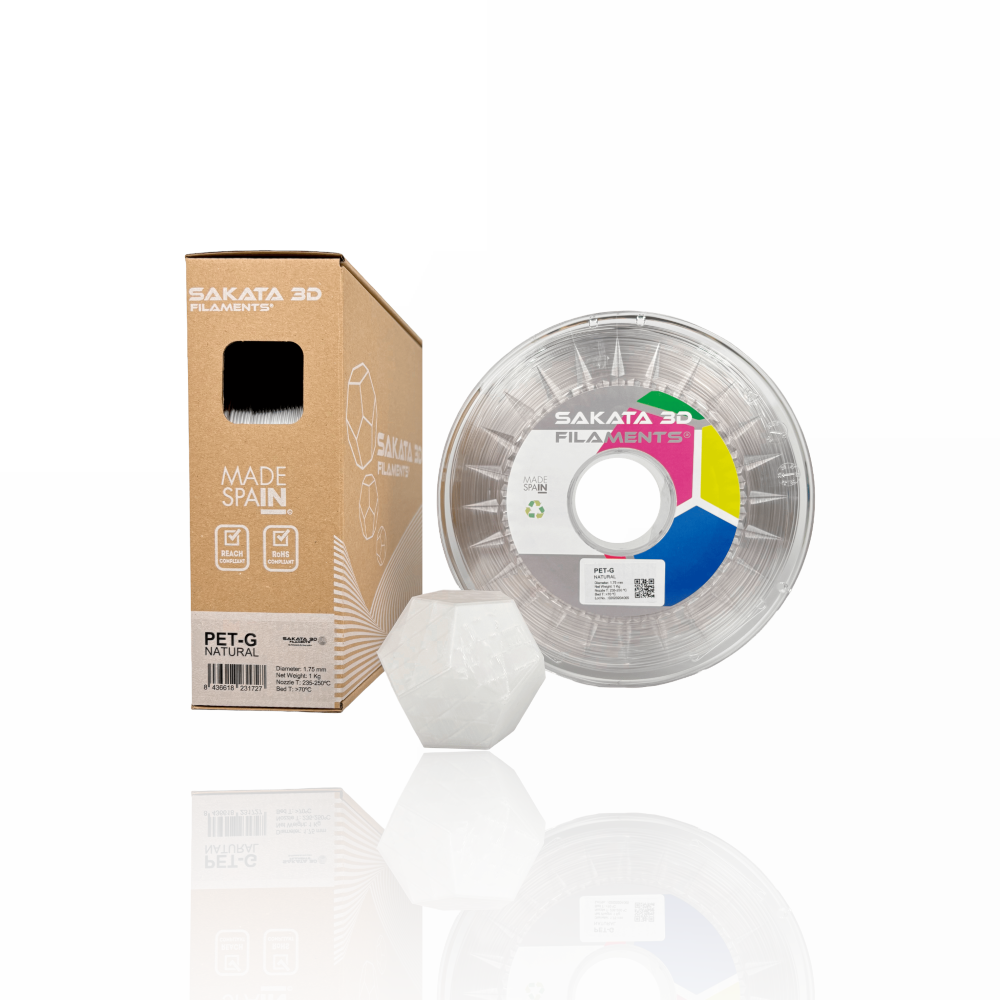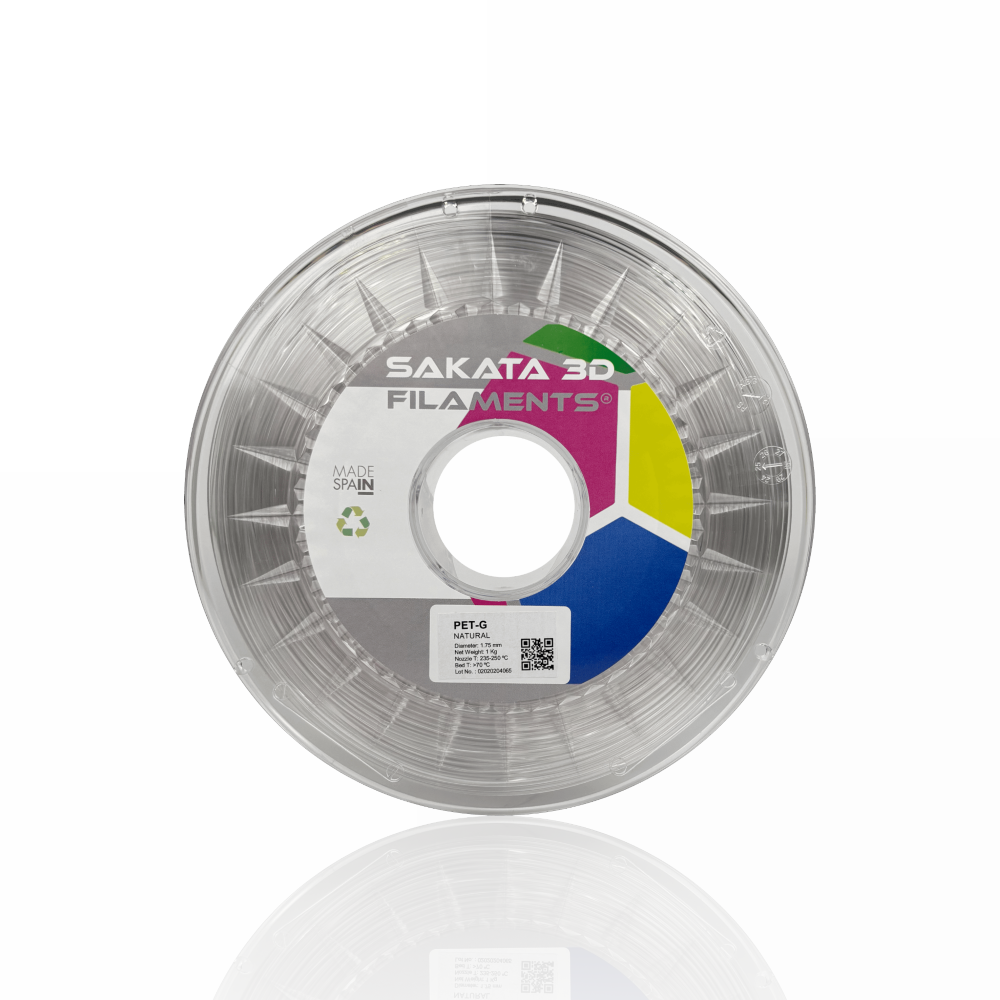 O PET‑G da SAKATA 3D destaca-se pelo seu elevado desempenho mecânico, resistência às intempéries e resistência química, com especial ênfase na sua elasticidade. Graças à sua composição, permite criar peças transparentes ou translúcidas (cores translúcidas) com superfícies brilhantes.