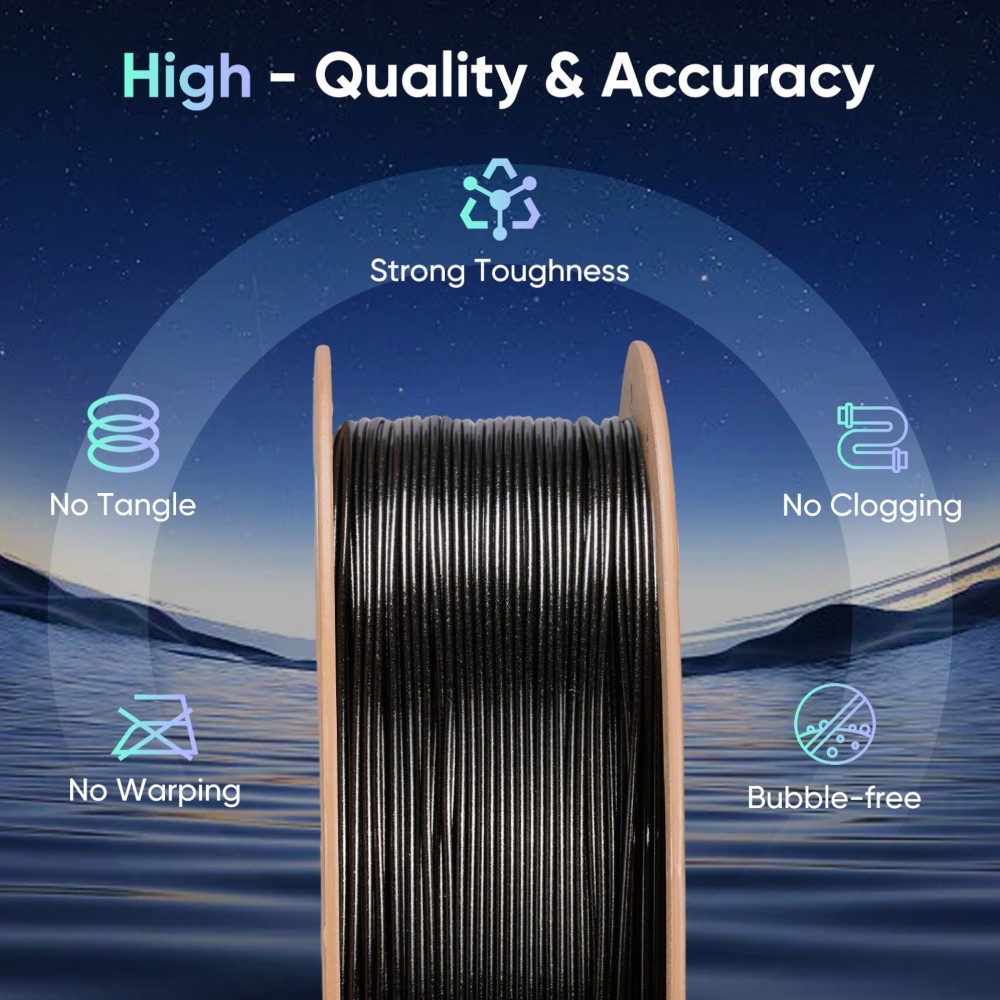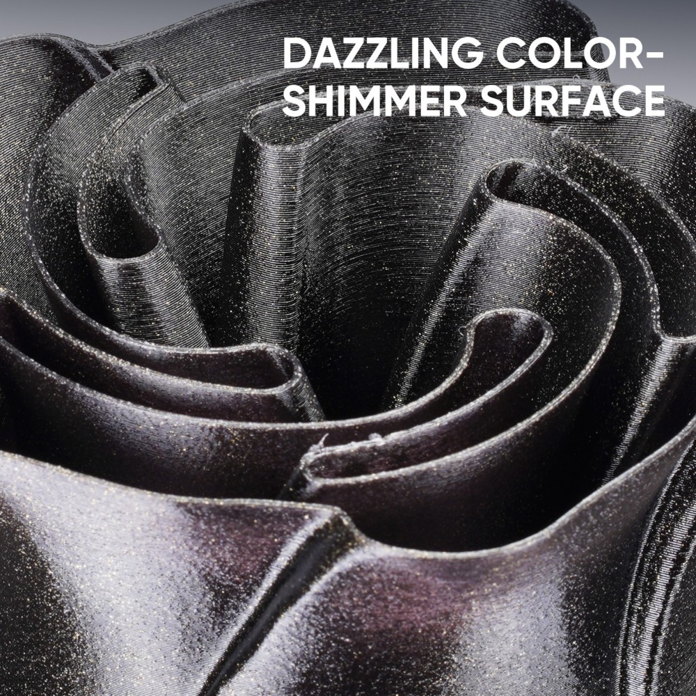 Além disso, o filamento exibe um efeito de mudança de cor reativo à luz, criando gradientes iridescentes que variam com o ângulo de visualização, adicionando profundidade visual e dinamismo aos projetos.
