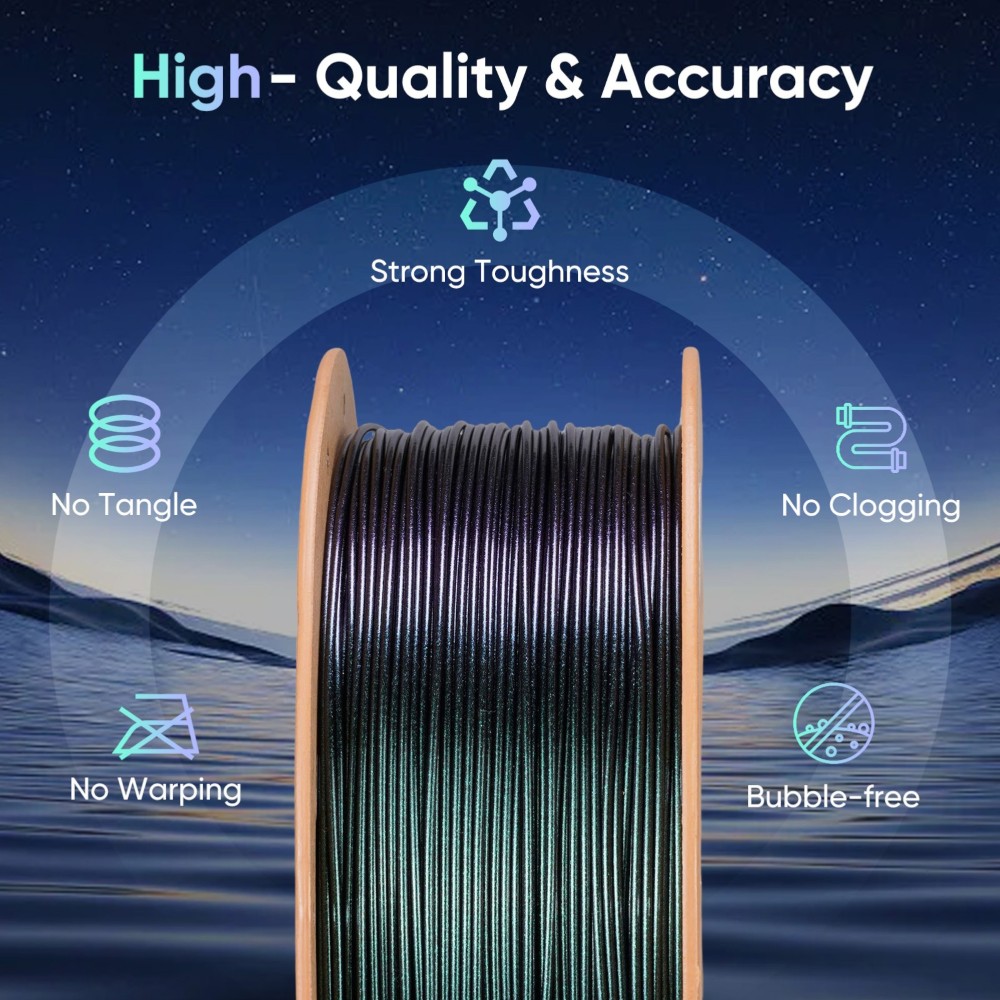 Além disso, o filamento exibe um efeito de mudança de cor reativo à luz, criando gradientes iridescentes que variam com o ângulo de visualização, adicionando profundidade visual e dinamismo aos projetos.