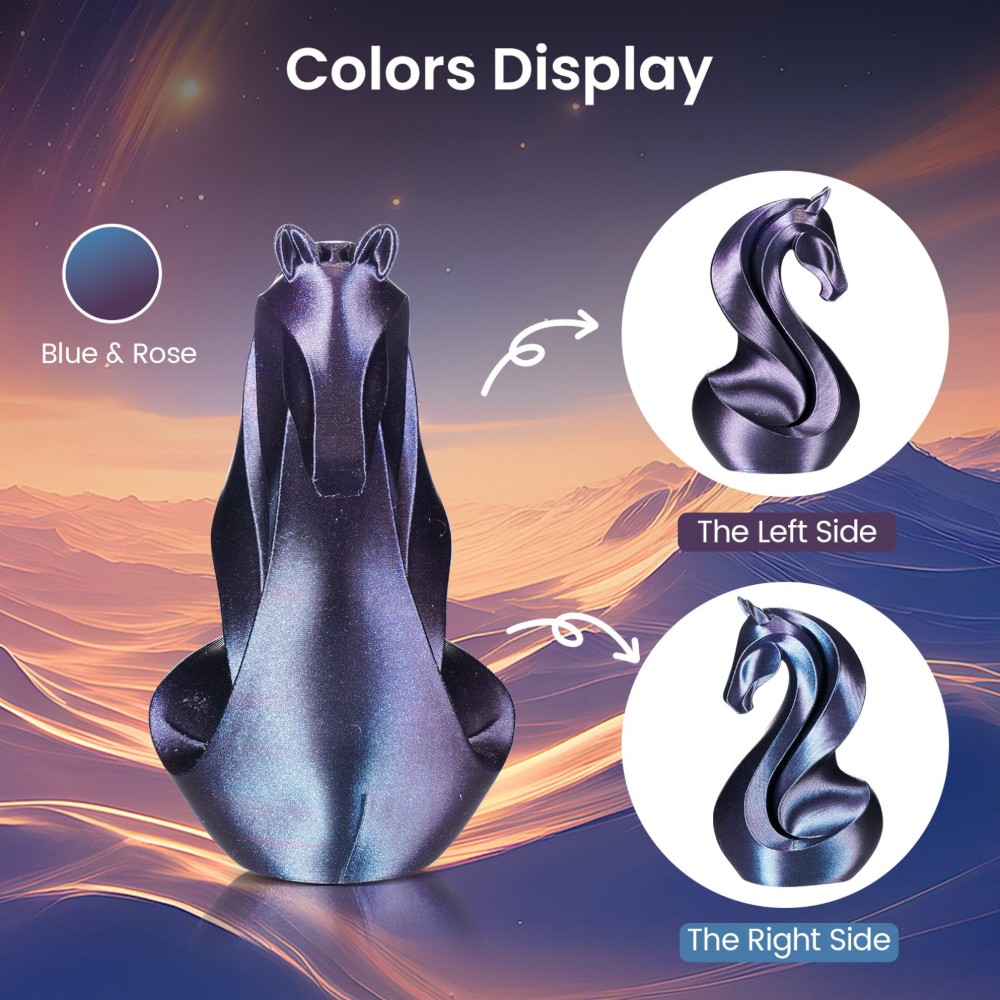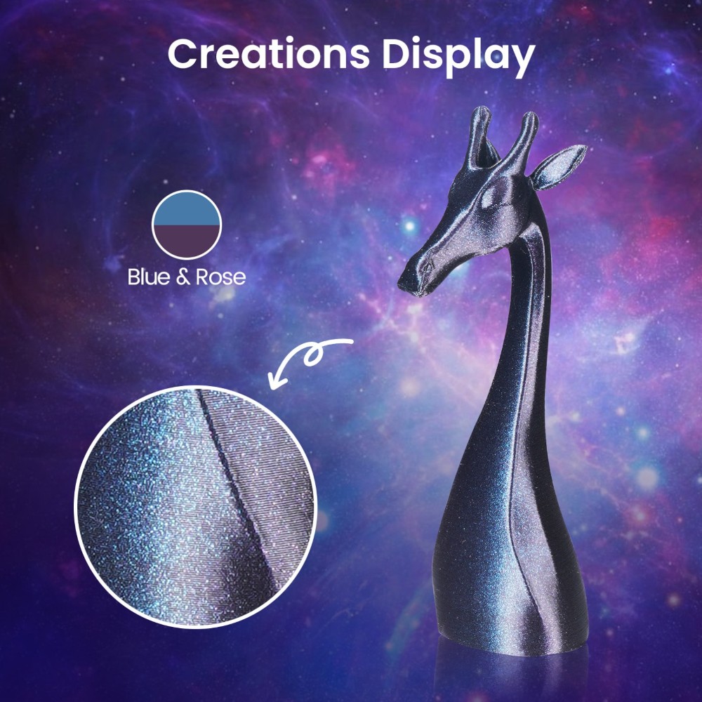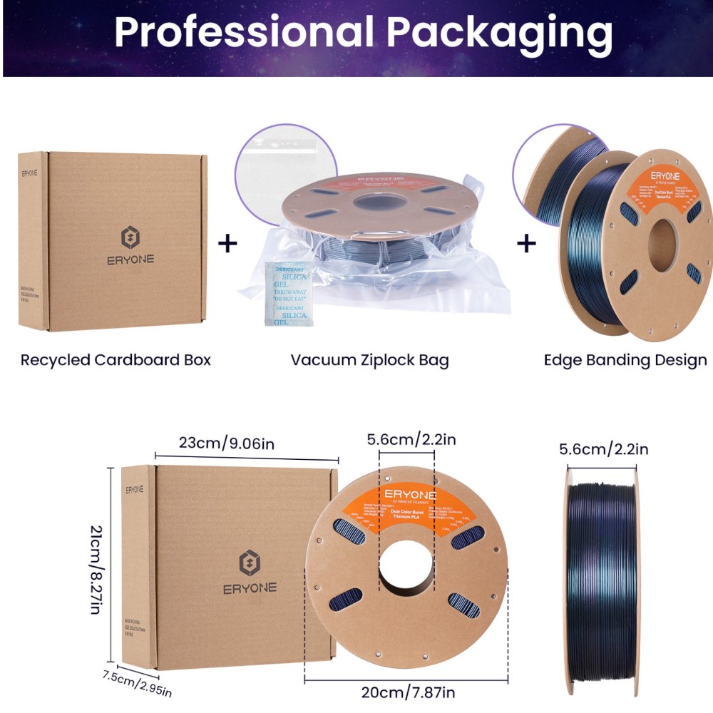 O filamento Eryone Burnt Titanium PLA oferece mudanças de cor cativantes, visíveis sob diferentes iluminações e ângulos, criando uma atmosfera tecnológica única e proporcionando uma experiência visual e tátil excecional.