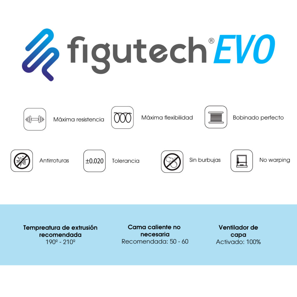 Figutech EVO é o filamento da mais alta qualidade da sua marca, sendo que foram modificadas as suas propriedades mecânicas e conseguiram um produto com a máxima flexibilidade e resiliência para um material que oferece melhor resolução e fiabilidade para as suas impressões.
