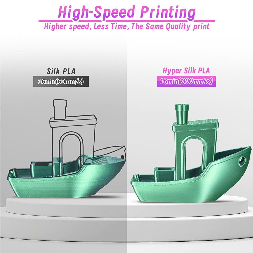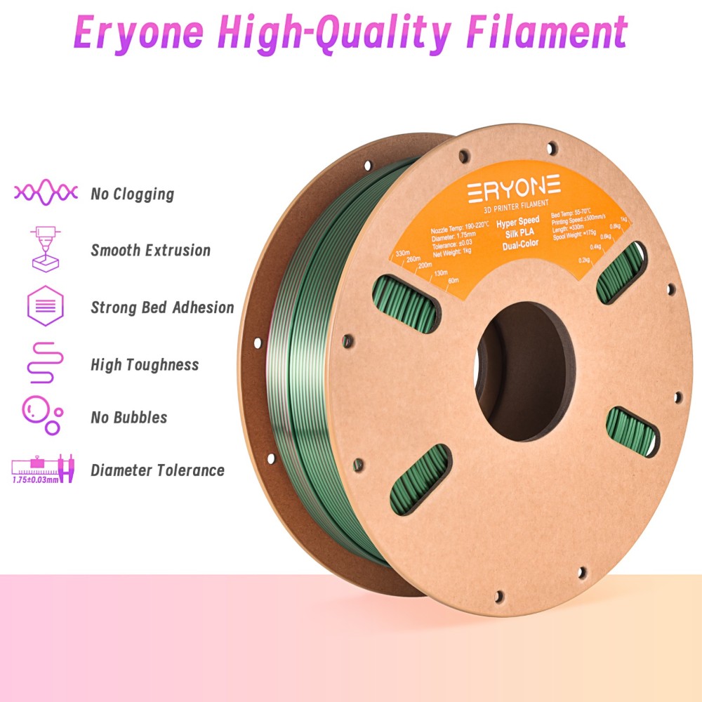 O filamento PLA de alta velocidade da ERYONE possui fluidez melhorada, permitindo que derreta rapidamente e flua de forma suave, alcançando velocidades de impressão até 500 mm/s.