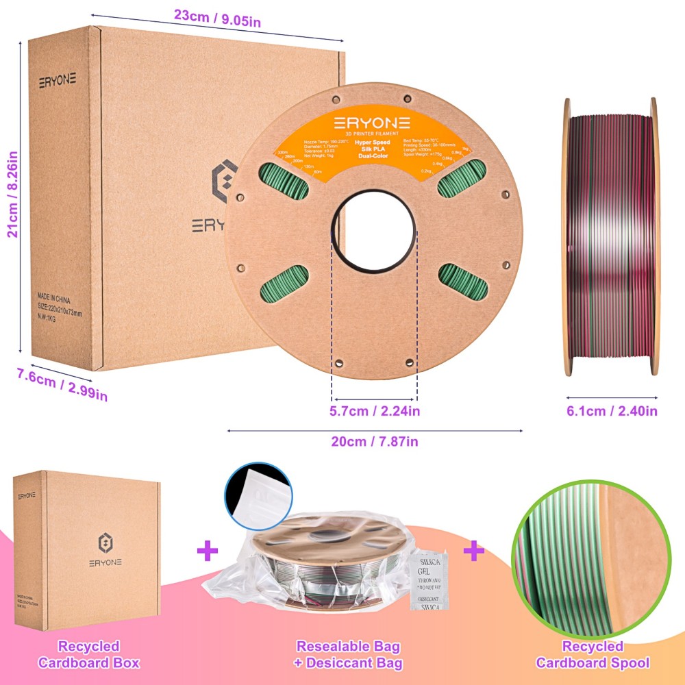 O filamento PLA Silk de Alta Velocidade Dual-Color é enrolado totalmente de forma mecânica, garantindo fios organizados e sem emaranhados.