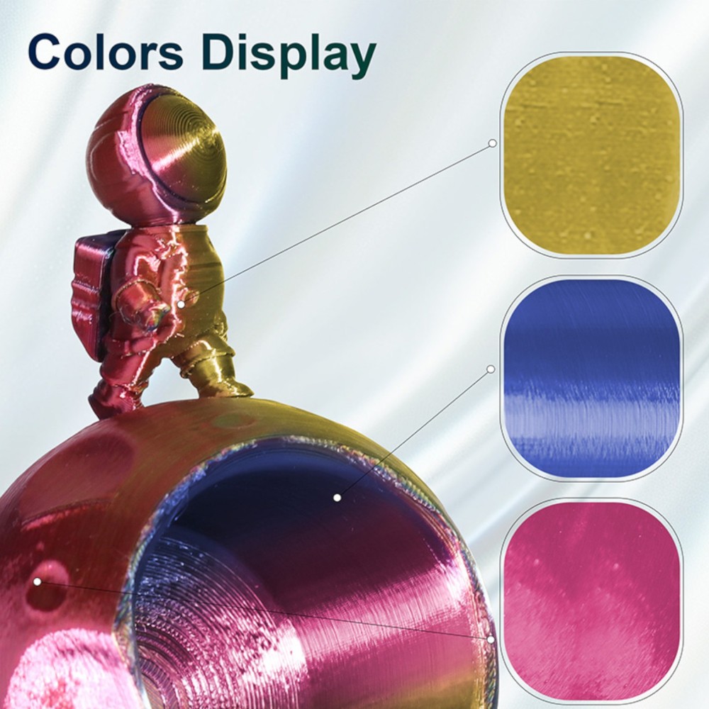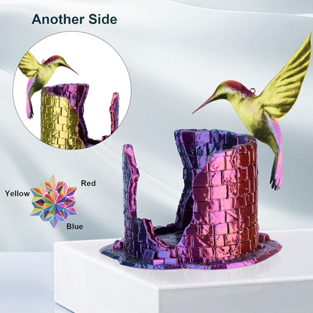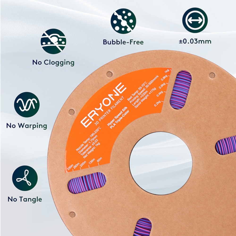 O ERYONE Ultra Silk Twist Rainbow para impressoras 3D é um filamento coextrudido com três cores, criando um efeito visual único. A cada 5 a 8 metros, a cor alterna rapidamente, proporcionando transições marcantes e vibrantes nas impressões.