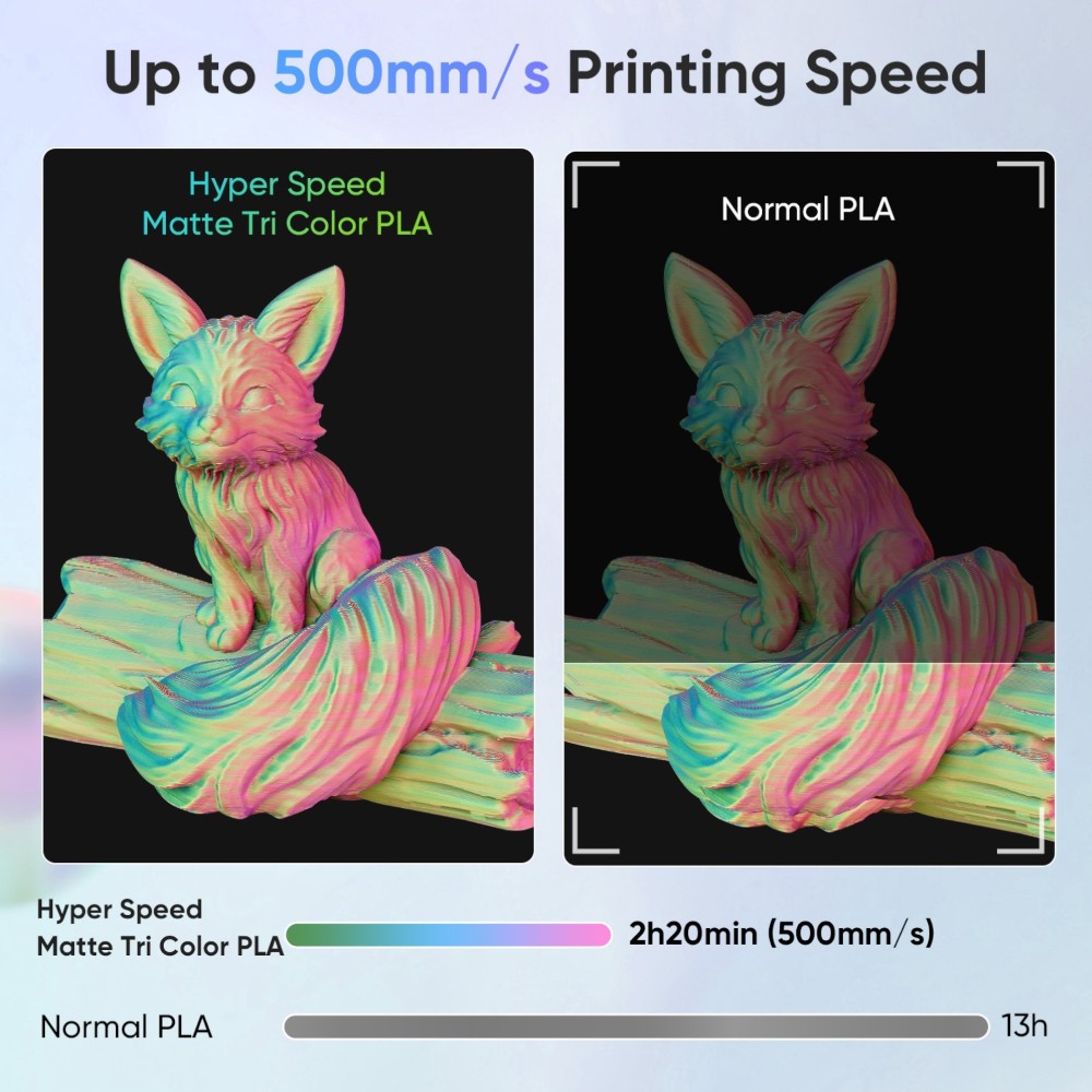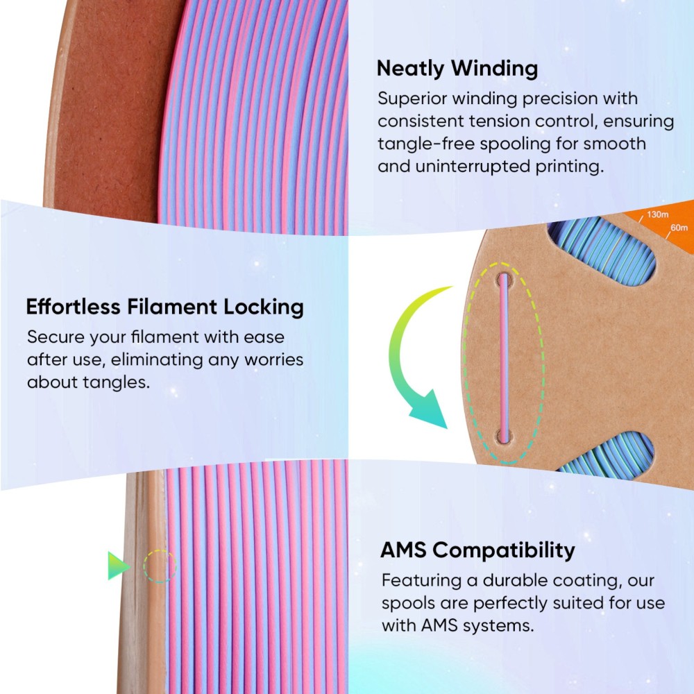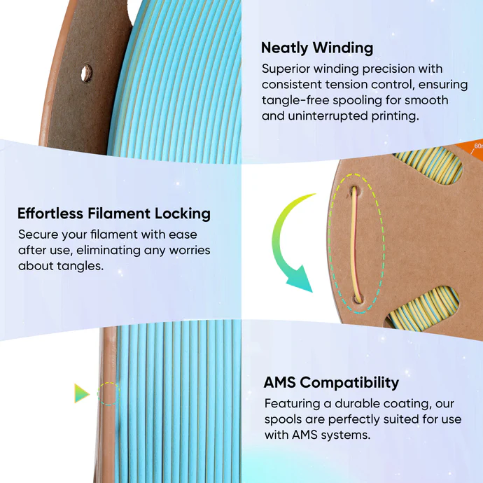 A coextrusão tri-cor cria variações de cor que mudam conforme o ângulo de visualização, dando às peças 3D um aspeto elegante e misterioso — perfeito para projetos artísticos.