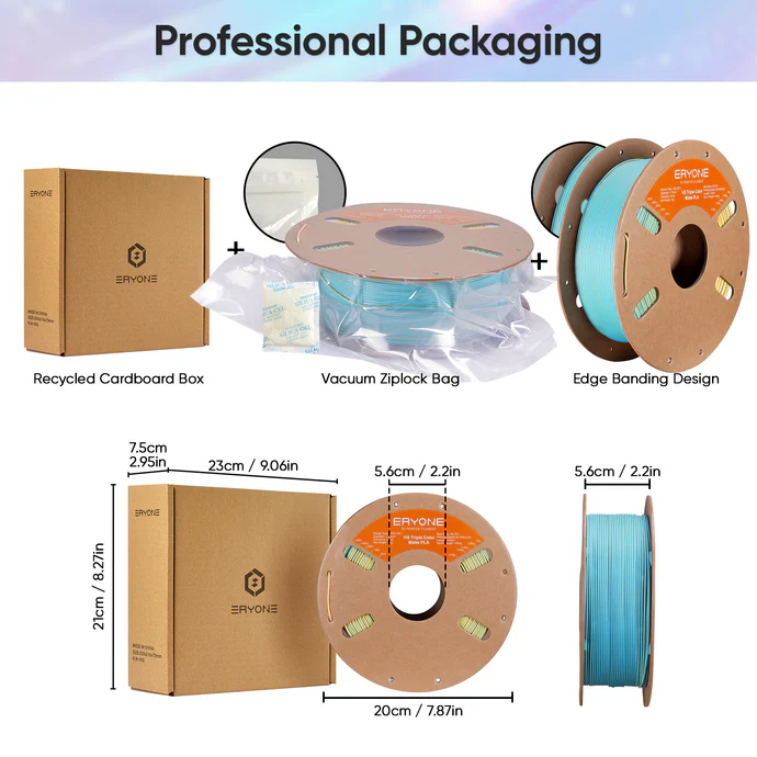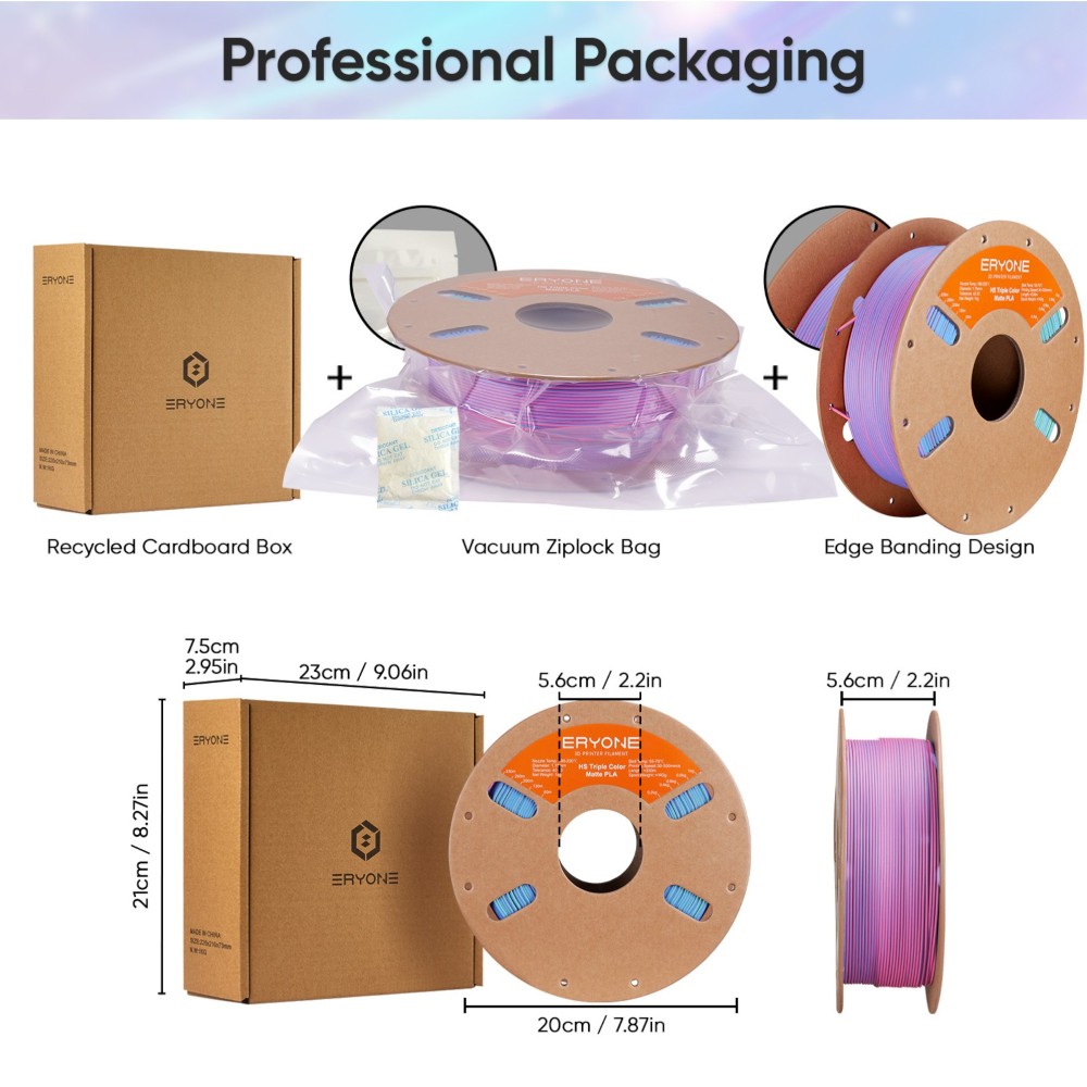 O filamento da ERYONE utiliza coextrusão tri-cor (tons que mudam conforme o ângulo de visualização) e apresenta uma superfície mate. Ideal para impressões 3D decorativas e artísticas que se querem destacar.