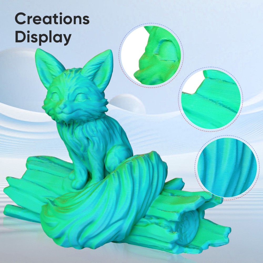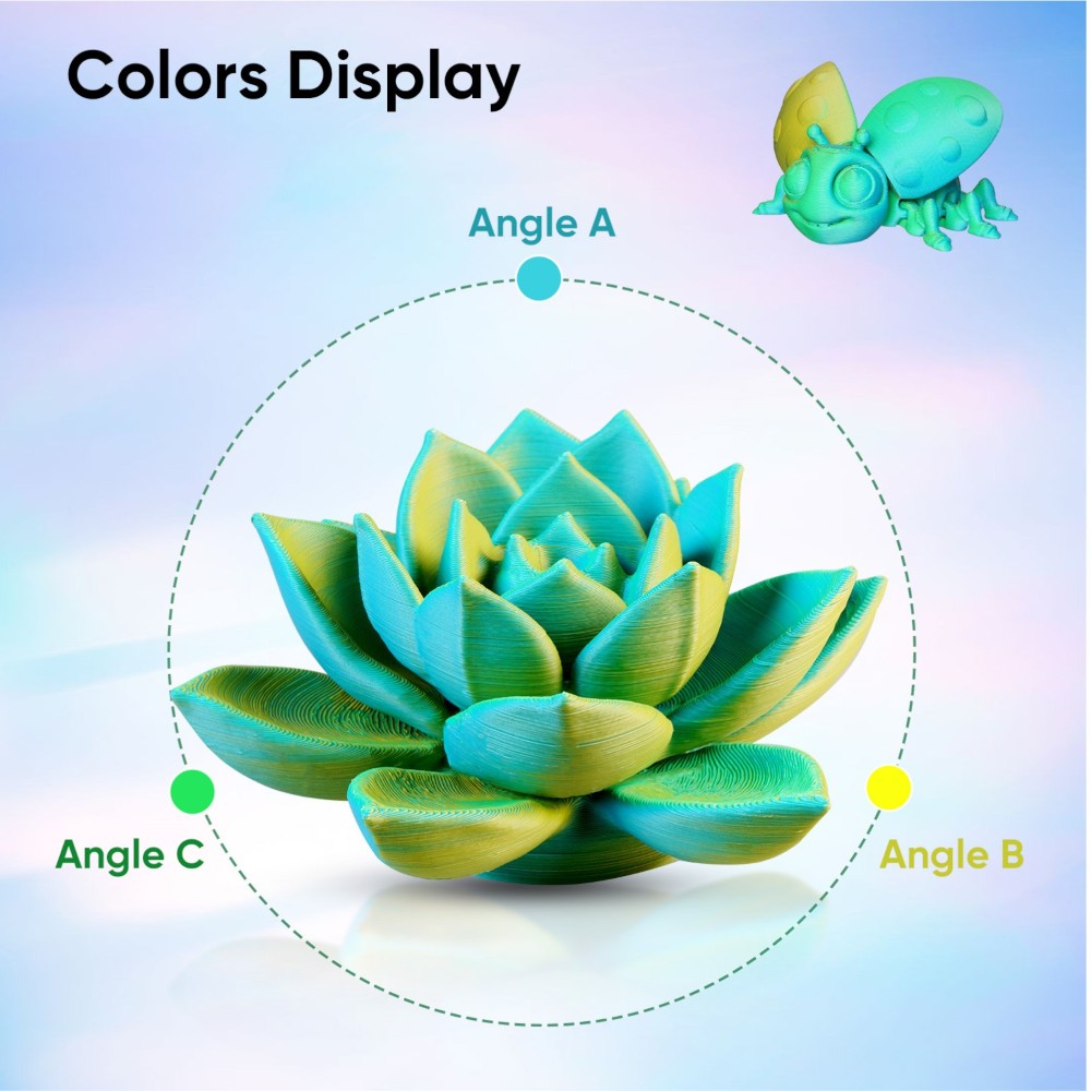 A coextrusão tri-cor cria variações de cor que mudam conforme o ângulo de visualização, dando às peças 3D um aspeto elegante e misterioso — perfeito para projetos artísticos.