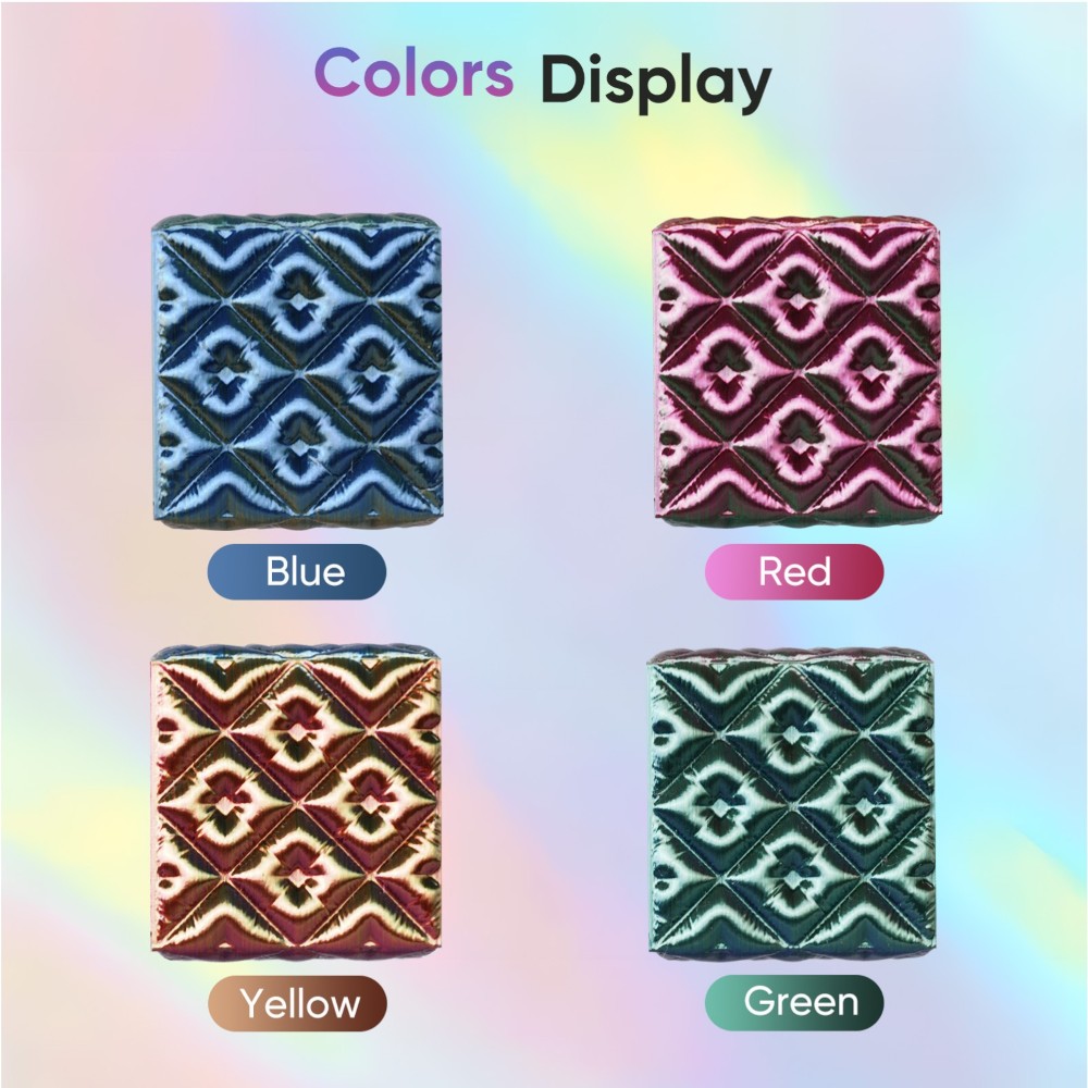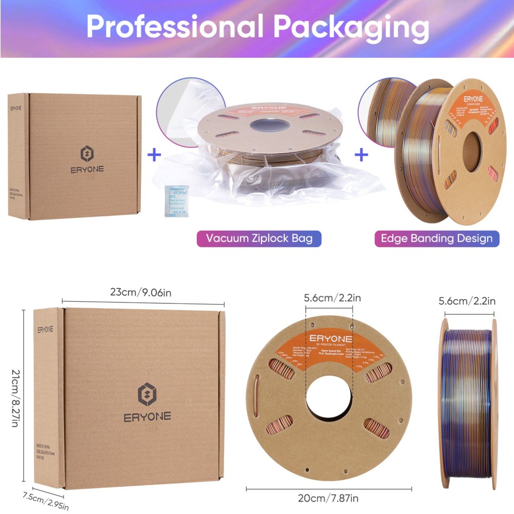 O ERYONE Ultra Silk Twist Rainbow para impressoras 3D é um filamento coextrudido com três cores, criando um efeito visual único. A cada 5 a 8 metros, a cor alterna rapidamente, proporcionando transições marcantes e vibrantes nas impressões.