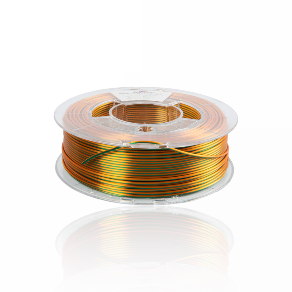 Descobre o poder transformador do Spectrum Magic SILK PLA, um filamento de PLA projetado para elevar a tua impressão 3D a um patamar artístico. Com a sua avançada tecnologia de co-extrusão, este filamento combina duas cores vibrantes numa só tira, criando um efeito óptico fascinante de mudança de cor que varia com a luz e o ângulo de visão. Este efeito não só dá vida aos teus projetos, mas também captura a atenção, tornando cada peça uma exposição de cor e movimento.