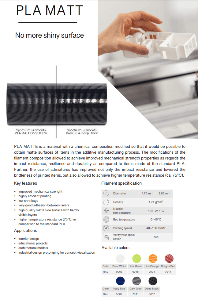 Spectrum PLA MATT é um PLA desenvolvido com uma composição química de forma a obter um acabamento final MATE em vez de brilhante.
