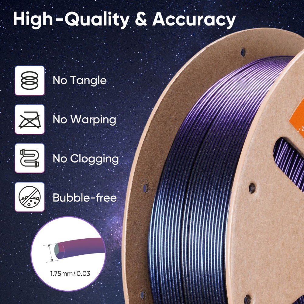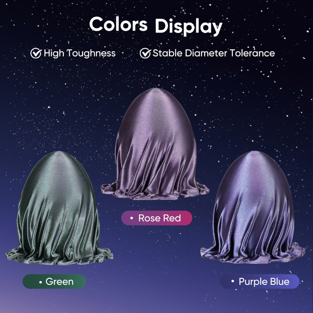 Este filamento oferece profundidade metálica impressionante, que muda de aparência consoante o ângulo, sendo perfeito para armaduras de cosplay, joalharia e modelos de exposição.
