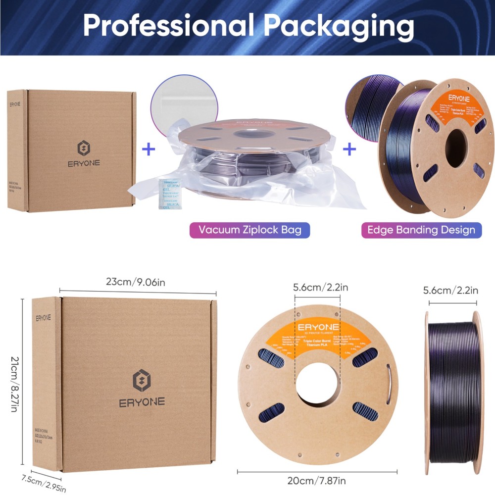 O filamento Eryone Burnt Titanium Triple PLA destaca-se pelas suas mudanças de cor cativantes, visíveis sob diferentes iluminações e ângulos, criando uma atmosfera tecnológica única e oferecendo uma experiência visual e tátil excecional.