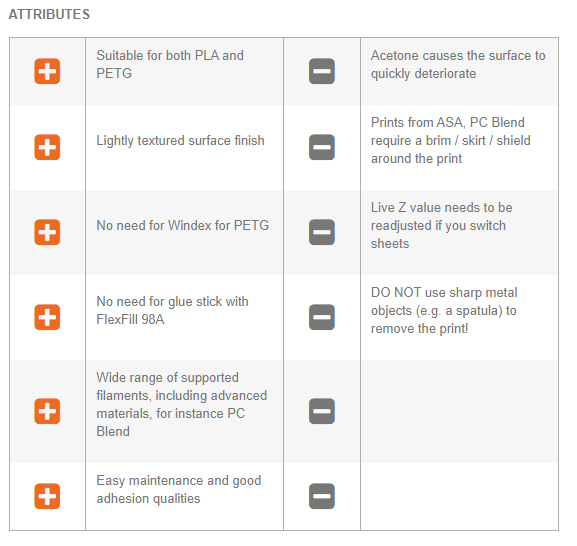 Polycarbonate – prints better on satin (compared to smooth and textured sheets) – when printing with PC often, glue stick layer is recommended to prevent possible damage to the sheet.