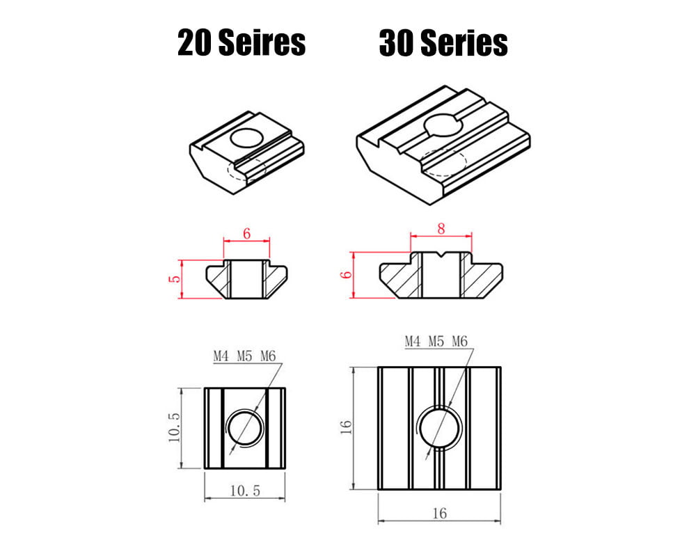 Porca Roscada em T ( T-Nut ) com furação rosca M4 para perfil 2020.