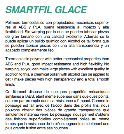 Filamento 3D PVB Smartfil Glace Natural M 750g da marca Smart Materials 3D, de excelente qualidade, para a Impressão 3D. Indicado tanto para utilizadores mais avançados e profissionais como para quem está a começar.