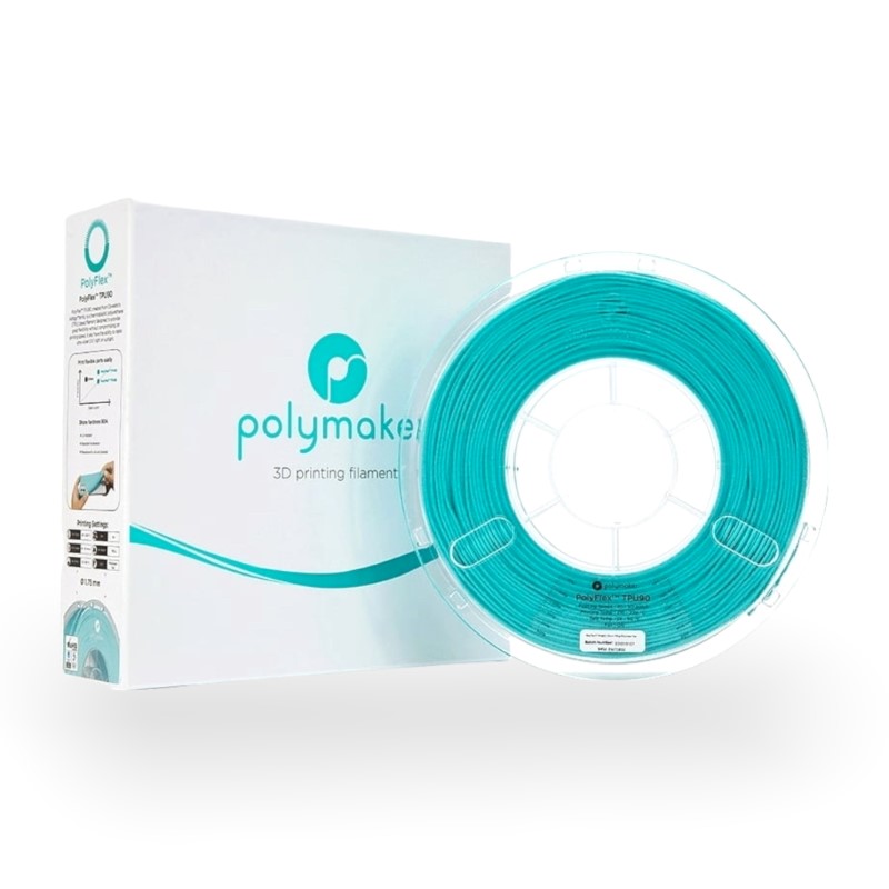 Isto proporciona peças impressas com uma dureza incrível que se pode esticar mais de 6 vezes antes de se partir. Apresenta mais ductilidade do que o PolyFlex TPU95 (dureza Shore 95A) mantendo a mesma dureza de impressão graças a um melhor índice de fusão. A sua resistência aos raios UV abre a porta a aplicações exteriores onde a flexibilidade e durabilidade são necessárias. O PolyFlex TPU90 está disponível em preto, branco, cinzento e azul-teal.