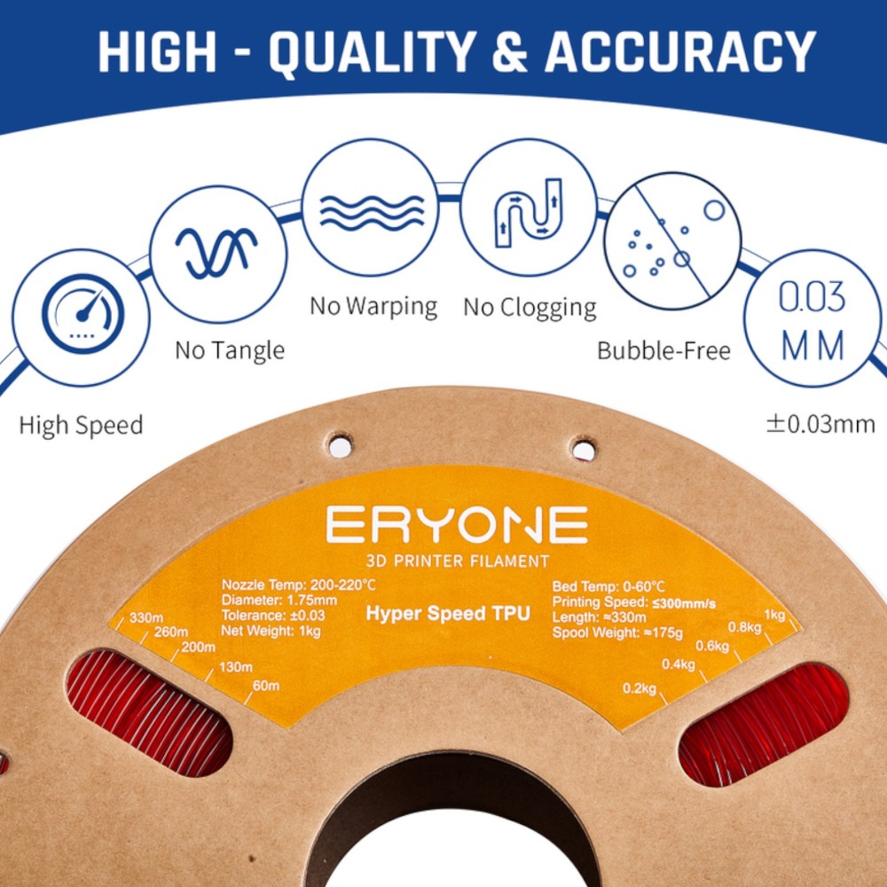 O filamento ERYONE TPU 1.75mm foi desenvolvido para impressão em alta velocidade, alcançando 30–300 mm/s, até 5 vezes mais rápido do que o TPU tradicional, proporcionando uma experiência de impressão 3D suave e eficiente.
