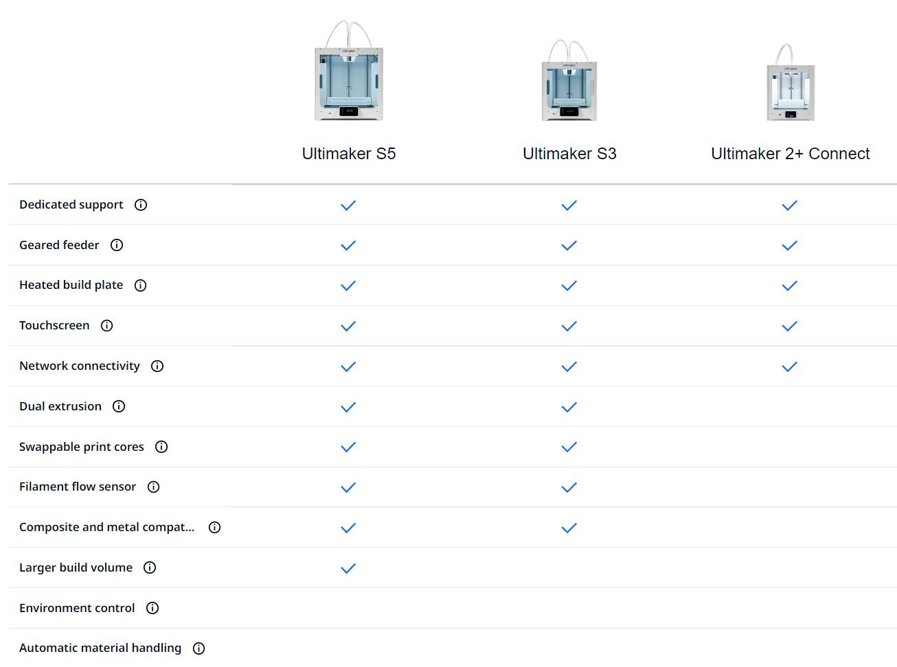 – Todos os materiais de construção da Ultimaker — PLA, PLA Tough, ABS, CPE, CPE+, Nylon, PC, PP, TPU-A95 – Sistema de filamento aberto